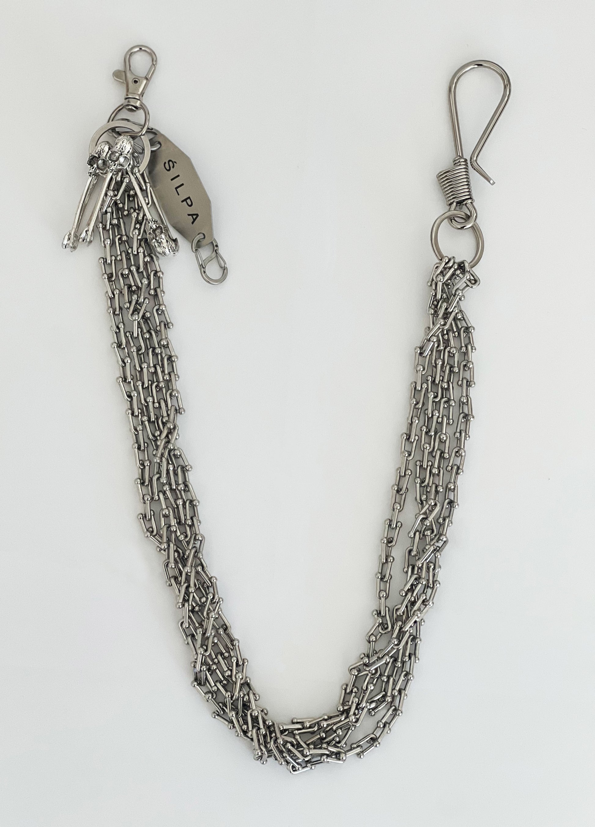 Elevate your style with the ŚILPA Multi-Layered Metal Jean Chain. Featuring three layers of stainless steel, edgy skull-shaped safety pins, and the engraved ŚILPA logo, this sleek accessory adds fearless elegance to any outfit. Perfect for bold mavericks who embrace individuality with confidence.